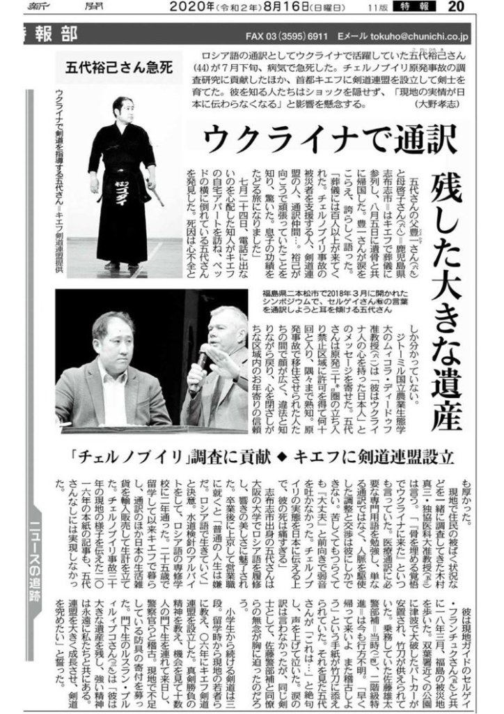 ウクライナにキエフ剣道連盟を設立した、鹿児島県志布志市出身の五代裕己さんは2020年に44歳の若さで心不全で急死されました。
