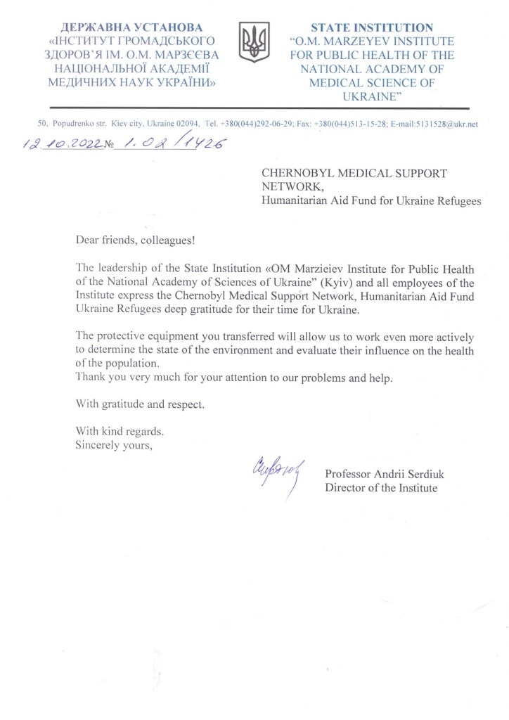 OM Marzieiev Institute for Public Health of the National Academy of Sciences of Ukraine(Kyiv)マルゼーエフ記念国立公衆衛生研究所の指導者と研究所の全職員は、チェルノブイリ医療支援ネットワーク、ウクライナ難民人道支援基金ふくしまキャンプの皆さんが、ウクライナのために時間を割いてくれたことに深い感謝の意を表します。今回お譲りいただいた保護具により、私たちは環境状態を把握し、住民の健康への影響を評価するために、より積極的に活動することができます。私たちの問題に目を向け、助けていただき、本当にありがとうございました。