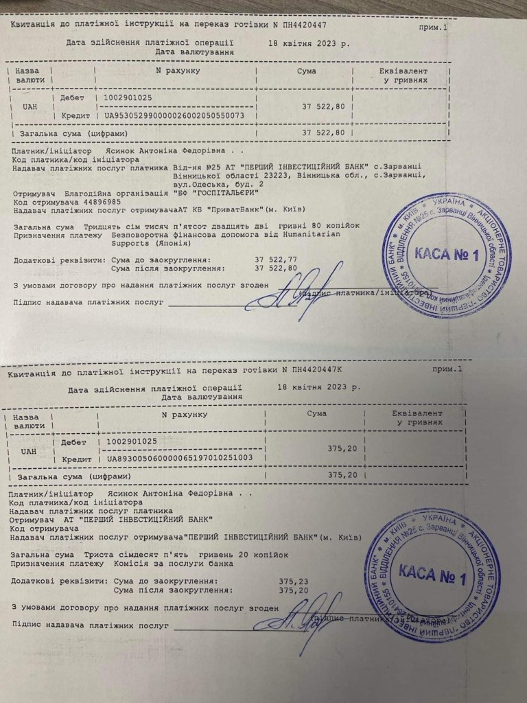 4月18日、私たちは現地のパートナーと協力し、ウクライナの最前線で直接働く救急医療隊のボランティア組織「ホスピタラー」に対して ₴37,522.80フリヴニャ(日本円で訳¥135,000)の寄付を行いました。