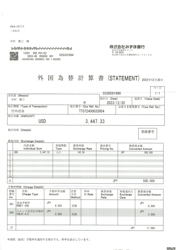 昨年12月20日、私たちヒューマニタリアン・サポーツは発電機購入資金として50万円を「みずほ銀行郡山支店」より、代表の木村真三名義にて送金いたしました。