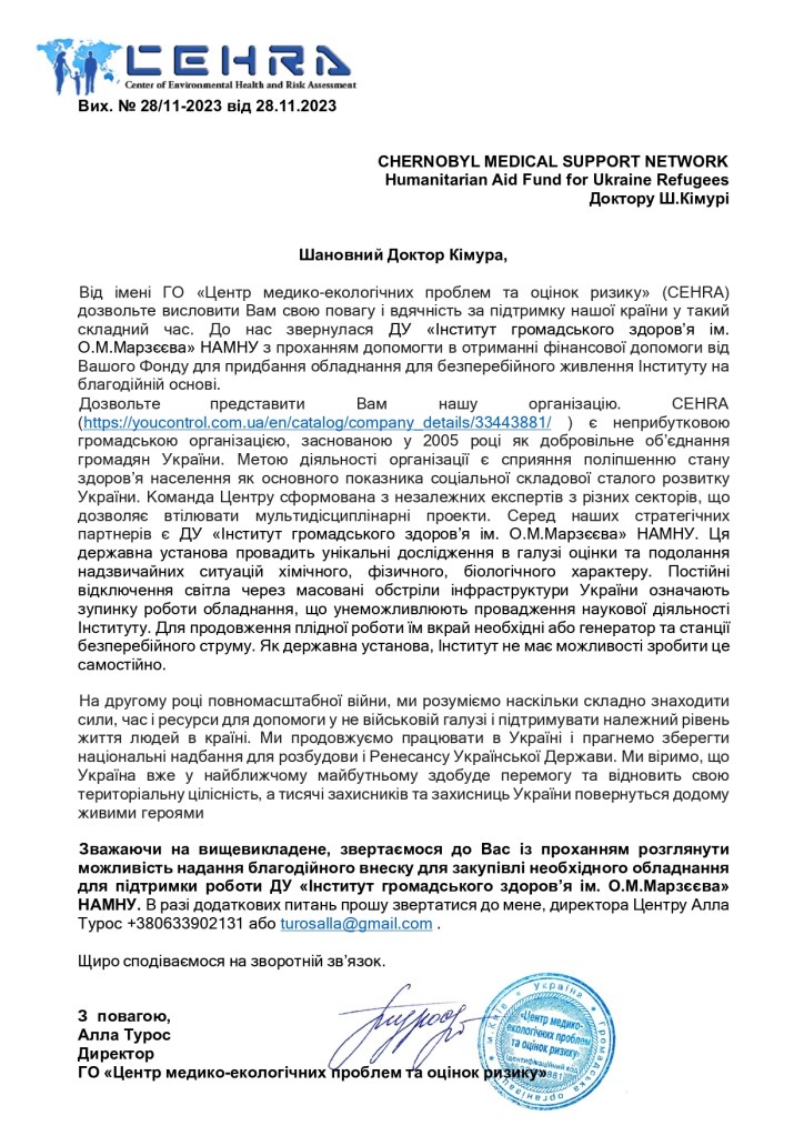 現在も戦闘が続き不安定なウクライナ国内ですが、再びマルゼーエフ記念国立公衆衛生研究所コブリャンシカ氏から緊急の要請がありました。