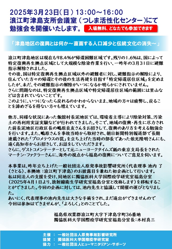 私たち一般社団法人ヒューマニタリアン・サポーツは、設立1年を迎えた 一般社団法人原発事故影響研究所(所在地:福島県浪江町、代表理事:池内了)と共に2025年3月23日に浪江町津島支所「つしま活性化センター」にて「津島地区の復興とは何か〜直面する人口減少と伝統文化の消失〜」を開催する事となりました。