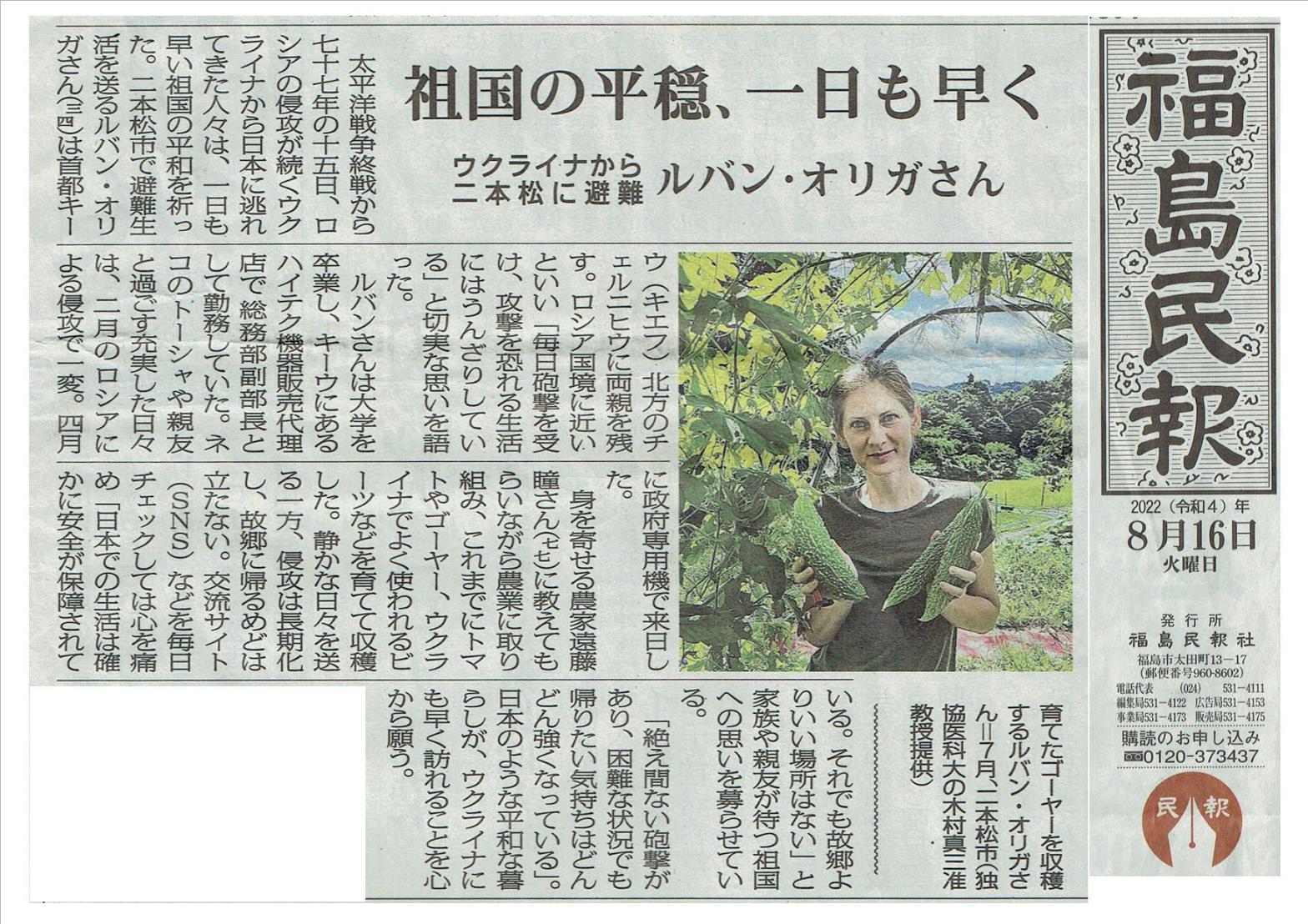 今年4月5日に政府専用機で来日し、私たちの用意した二本松市の農家で避難生活を続けていた、ウクライナ避難民のルバ続きを読む “ルバン・オリガさんが一時帰国しました。”